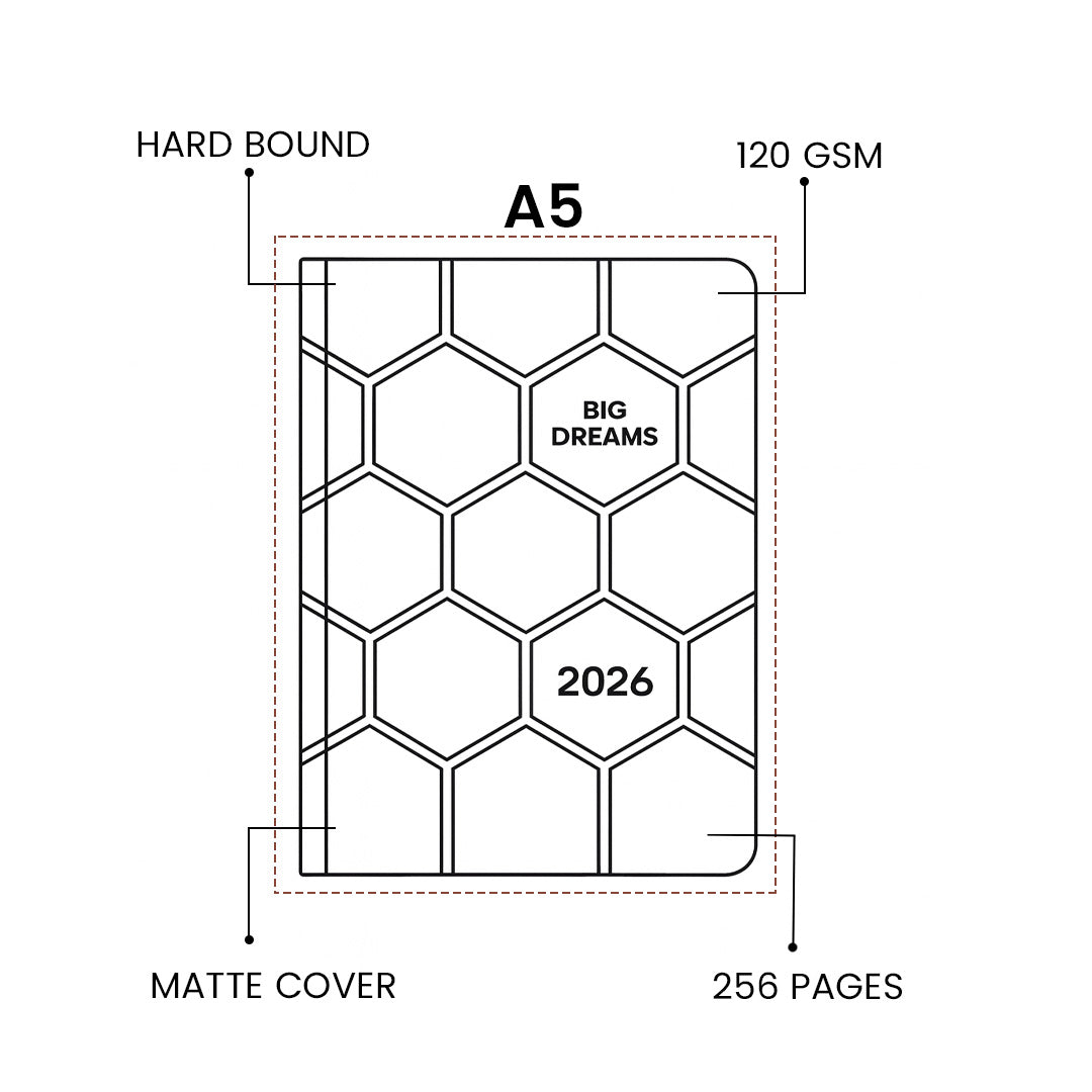 - The hardbound A5 planner features a premium matte cover with gold foiling, elastic band closure, and 256 durable FSC & PEFC certified 120 GSM pages. Comes with 2 coloured bookmark ribbons and dated pages for effortless navigation.