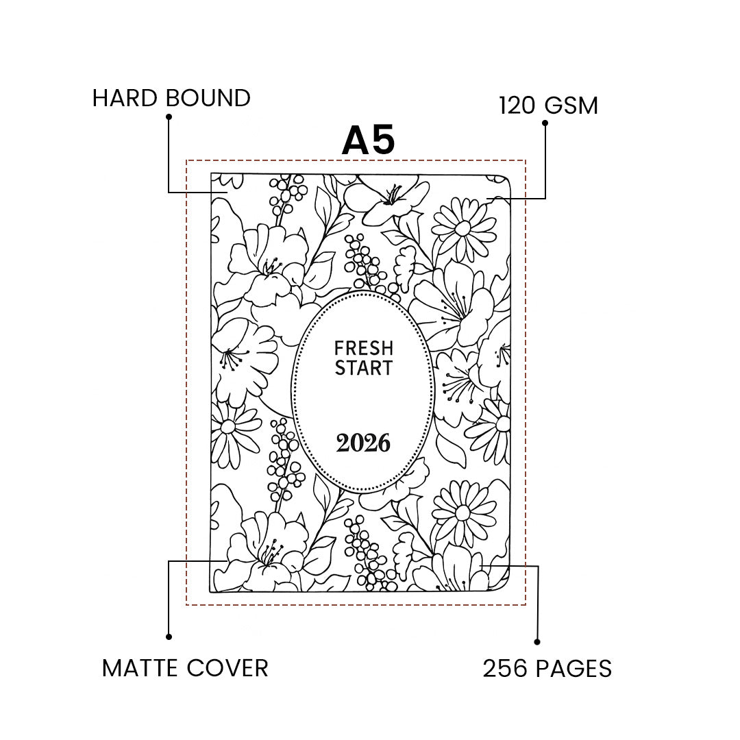 - The hardbound A5 planner features a premium matte cover with gold foiling, elastic band closure, and 256 durable FSC & PEFC certified 120 GSM pages. Comes with 2 coloured bookmark ribbons and dated pages for effortless navigation.