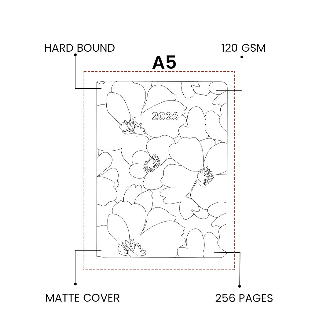 - The hardbound A5 planner features a premium matte cover with gold foiling, elastic band closure, and 256 durable FSC & PEFC certified 120 GSM pages. Comes with 2 coloured bookmark ribbons and dated pages for effortless navigation.
