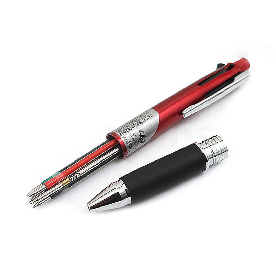 - Four ballpoint ink components (black, blue, green, and red), plus a 0.5 mm mechanical pencil component.