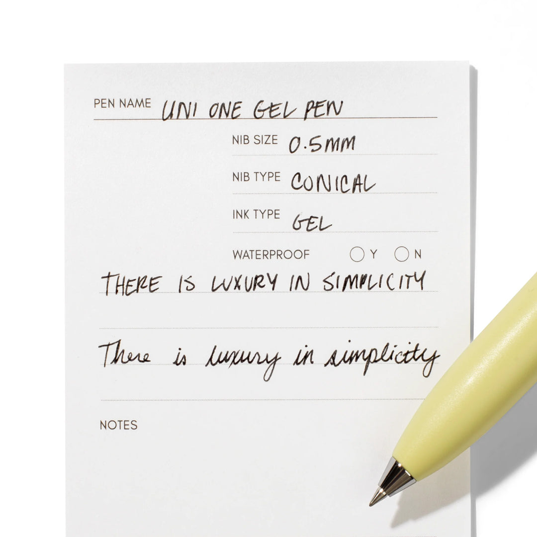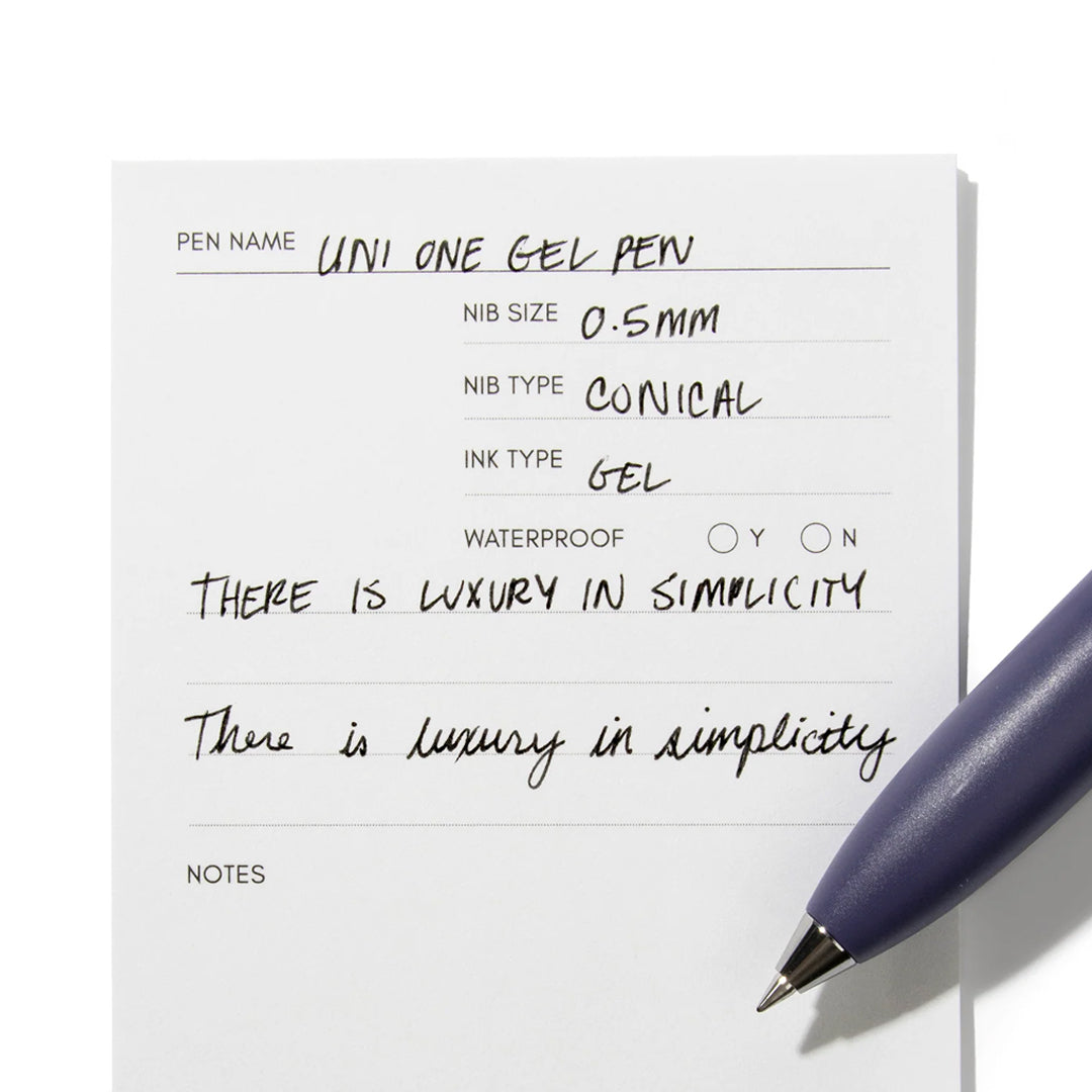 - Enjoy vibrant, easy-to-read notes with the Uni-ball One gel pen. Its ink is specially formulated with large pigment particles that stay on the surface of the paper instead of getting absorbed into it.