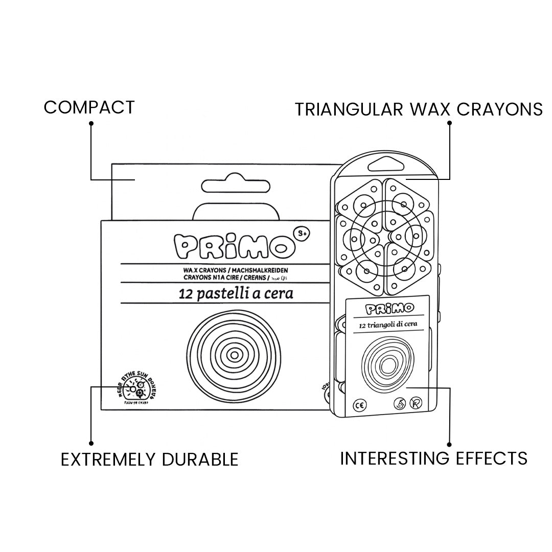 - Triangular wax crayons, very resistant, in PP box, 12 colours including gold and silver.