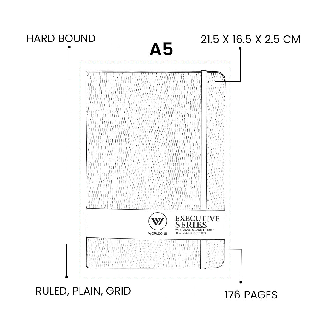- The Worldone Executive Series A5 Ruled Notebook combines elegance and functionality, making it perfect for professionals, students, and planners.