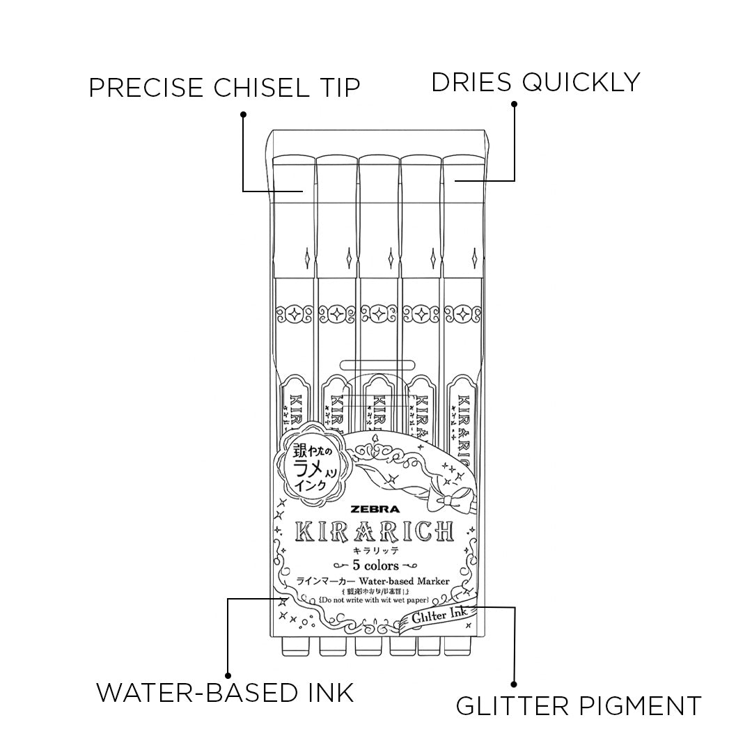 - The zebra kirarich highlighter 5 pcs set adds a touch of sparkle to your notes, journals, and creative projects.