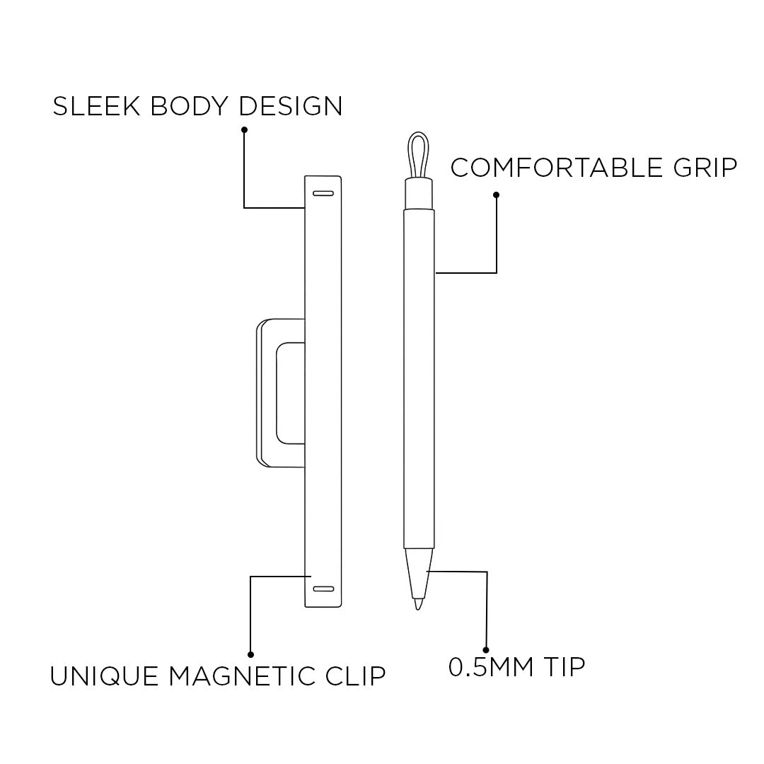 - It features a unique magnetic clip that easily attaches to notebooks, planners, or folders keeping your pen always within reach.