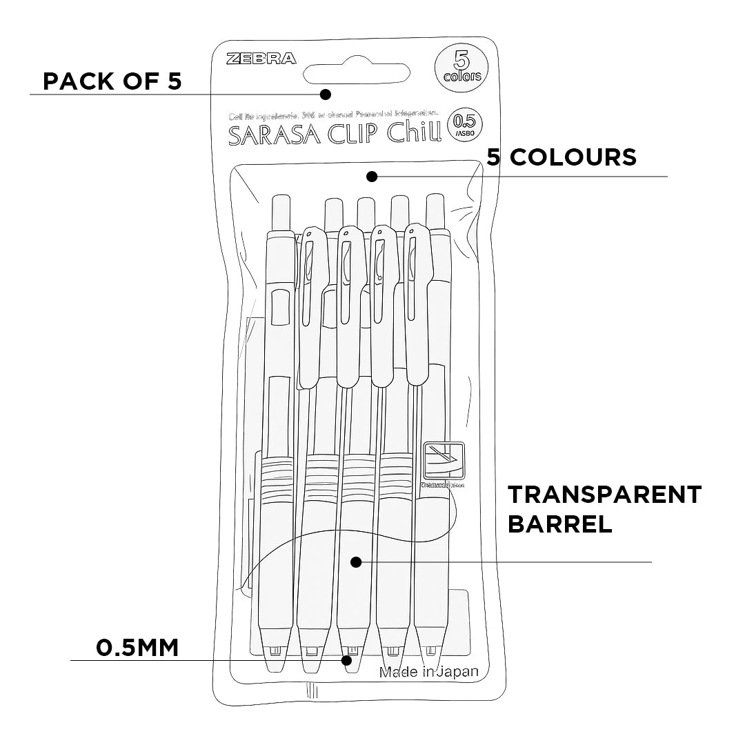 - Add a touch of cool creativity to your writing with the Zebra Sarasa Clip Chill 0.5mm Gel Pen Set.