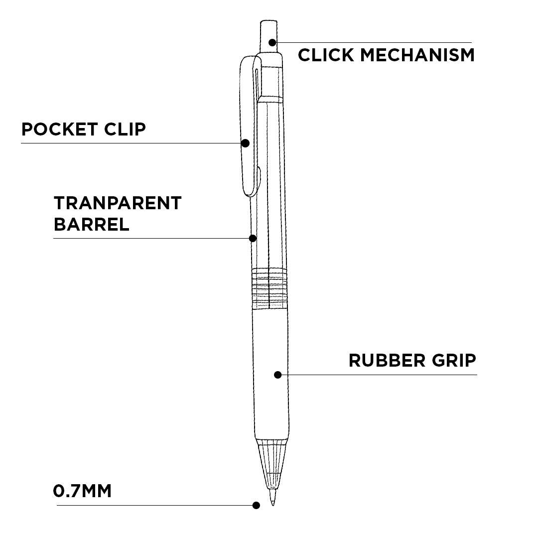 - It features a soft rubber grip and has a spring-loaded clip that attaches easily to your pocket or notebook.